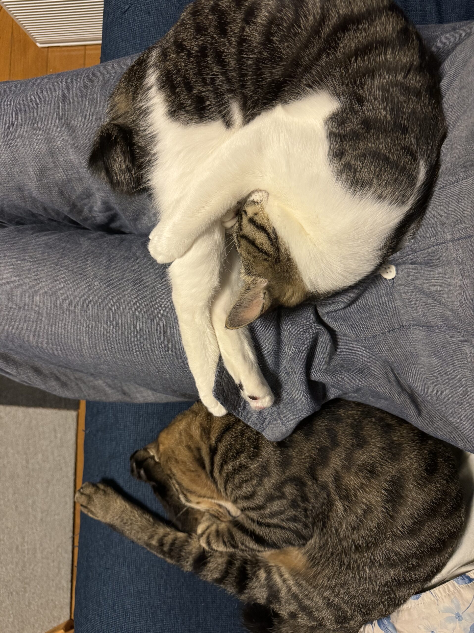 うちのむぎとまるは、膝乗りのスタイルがまったく異なります。むぎは自分のタイミングでやってくる膝乗り派。まるは自分からは来ないけれど、連れてくるとリラックスして寝てくれるタイプです。2匹の違いを通じて、猫の膝乗り行動について解説します。