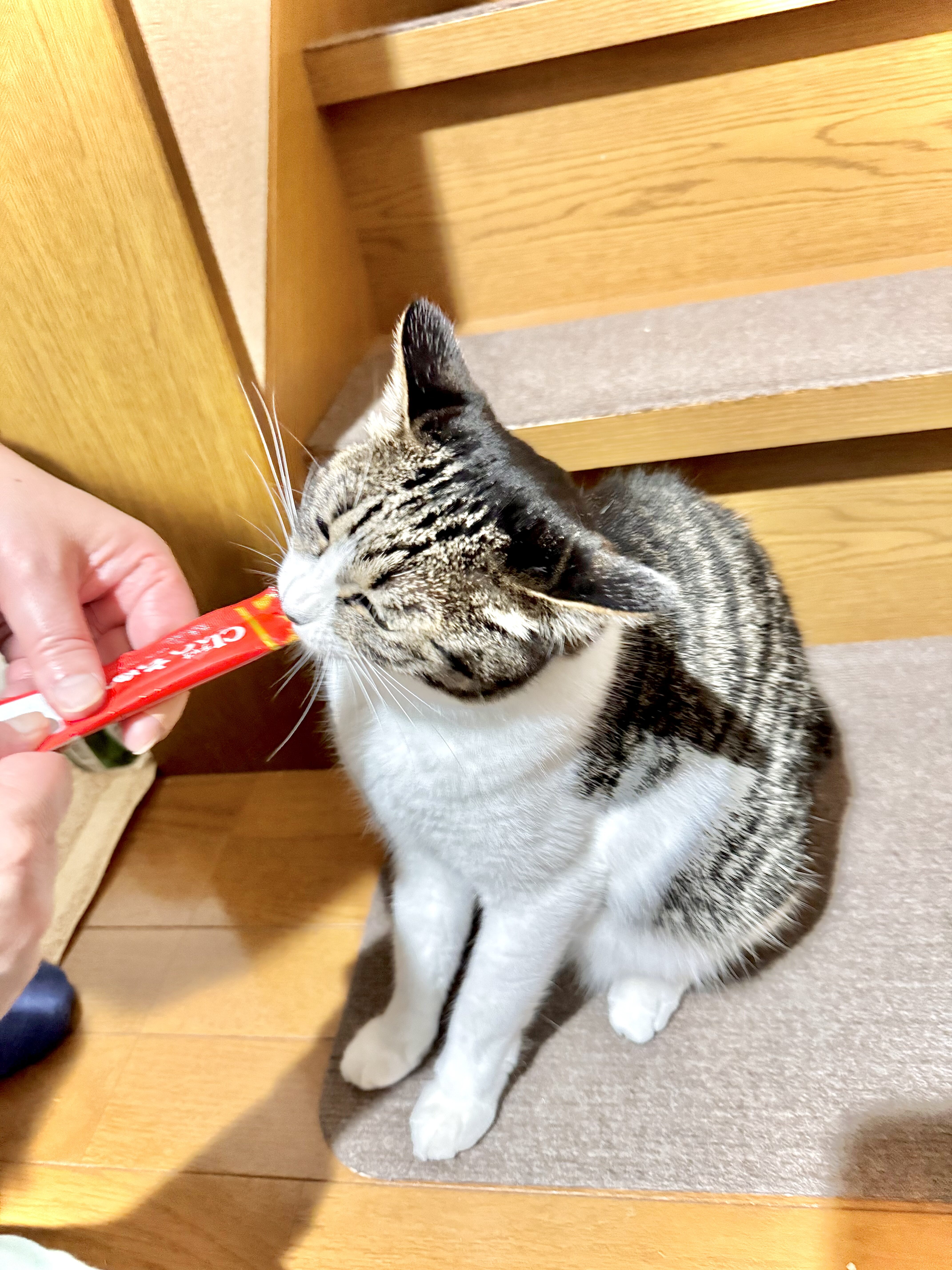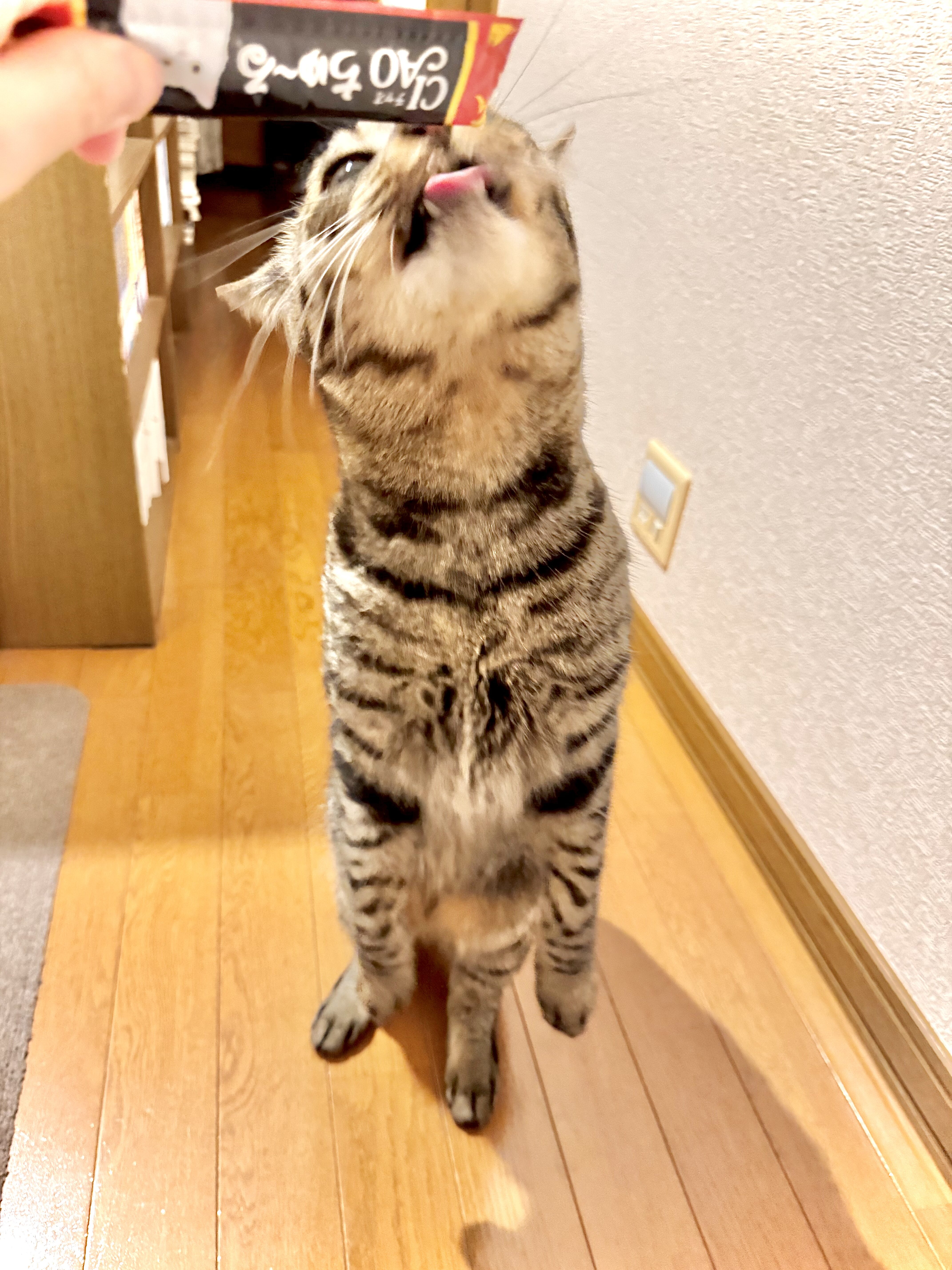 袋を持って1階のリビングでカシャカシャと音を立てると、2階にいても聞こえるのか飛んできます。ワードローブの上から降りてくる「ドンッ!」という着地音が聞こえてから数秒でキッチンまで来ます。普段のご飯への反応とは明らかに違う「本気の食欲」が出るおやつです。