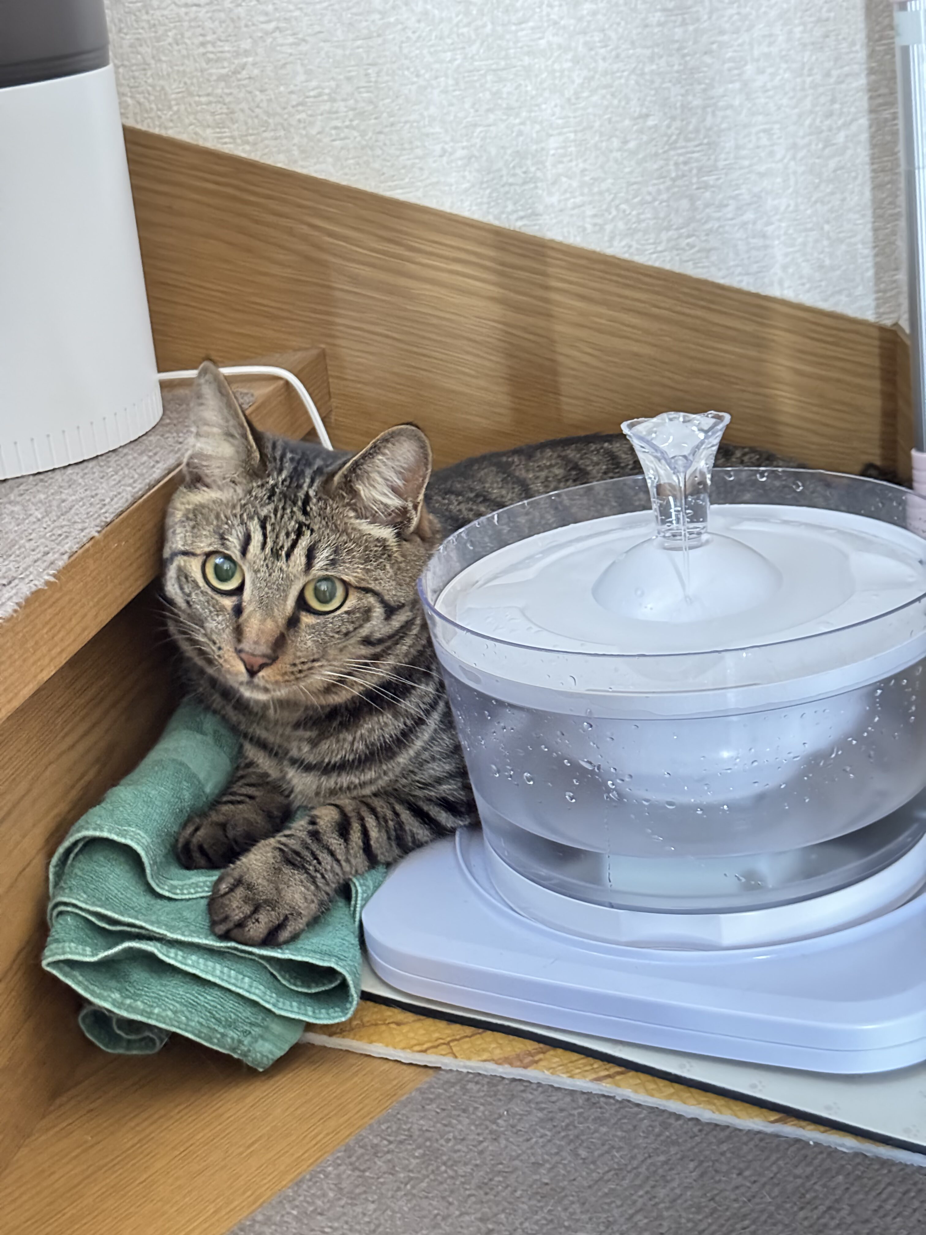 対策として、複数箇所に水飲み場所を置くのが効果的です。うちではリビングと廊下に置いており、どこにいても近くに水がある環境を作っています。