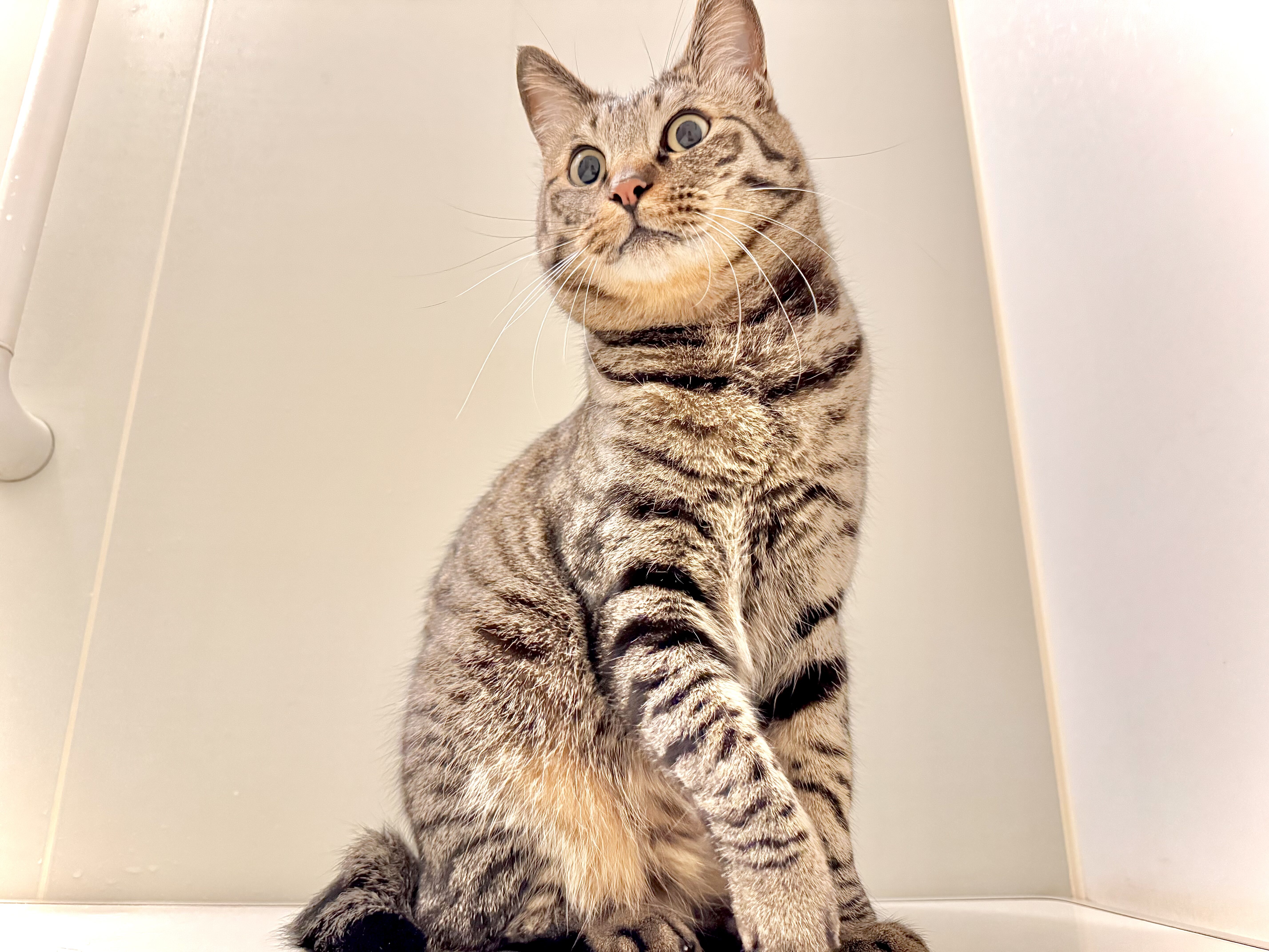まるはお風呂のドアを開けた瞬間、「ニャ!」と一声鳴いて入ってきます。呼んだわけではないのに、どこにいても気配を察知して飛んでくるレベルです。