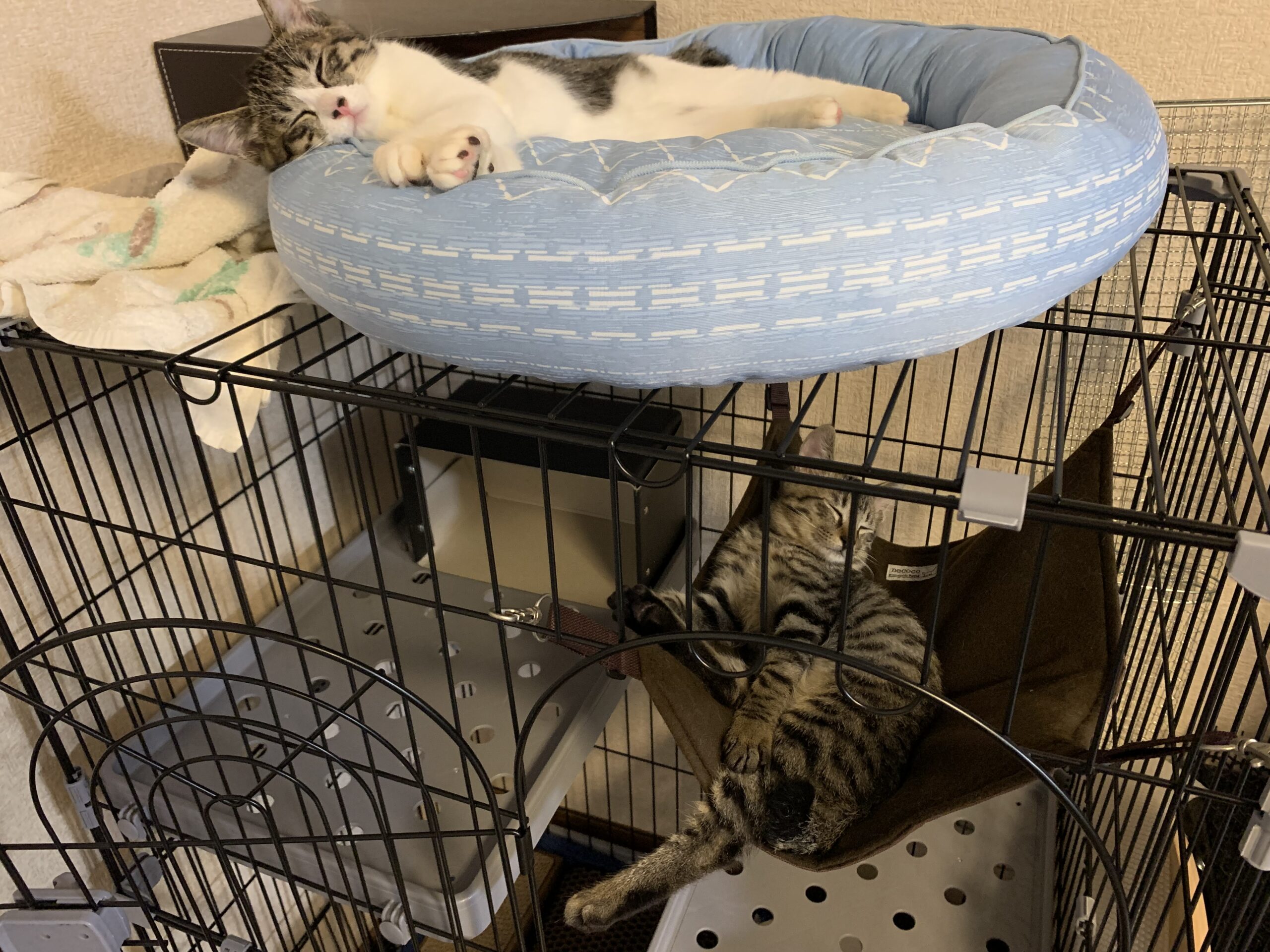 実際にむぎとまるは、飼い主が仕事で外出している日中も自分たちで追いかけっこしたり、キャットタワーで遊んでいます。帰宅したときにぐったりしているのは飼い主の方だけです。